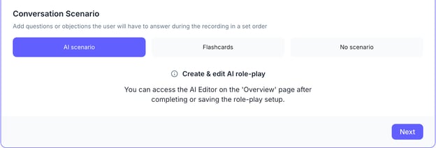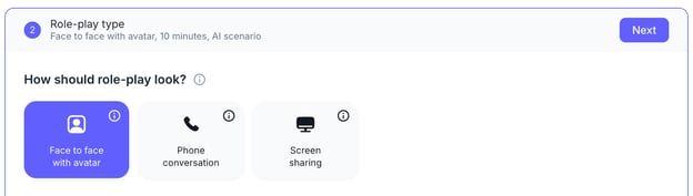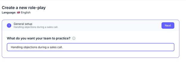 Define what you want your team to practice. Example: "Cold call with CIO" or "Handling objections during a sales call". That’s going to be the title of your role-play. Click Next to proceed.