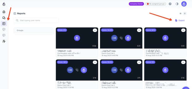 Tip: If Groups are enabled in your account, hover over the settings icon in Reports to see the option to export role-plays grouped by company structure.