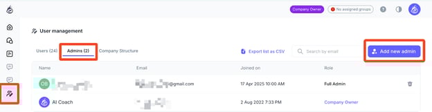 1. Click User Management icon in the left-side menu, go to the Admins tab, and then select Add new admin: