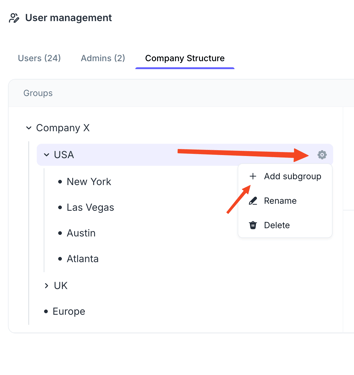 • Add admins — each can belong to only one group, but they automatically see every subgroup below them.
