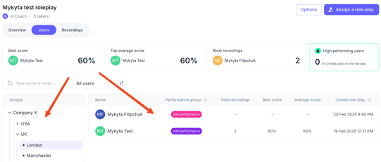 • A well-defined hierarchy organises role-play results, making it easy to filter teams and track their progress