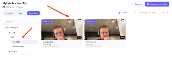 3. Once hierarchy rules are applied, role-play recordings will be filtered into their groups.